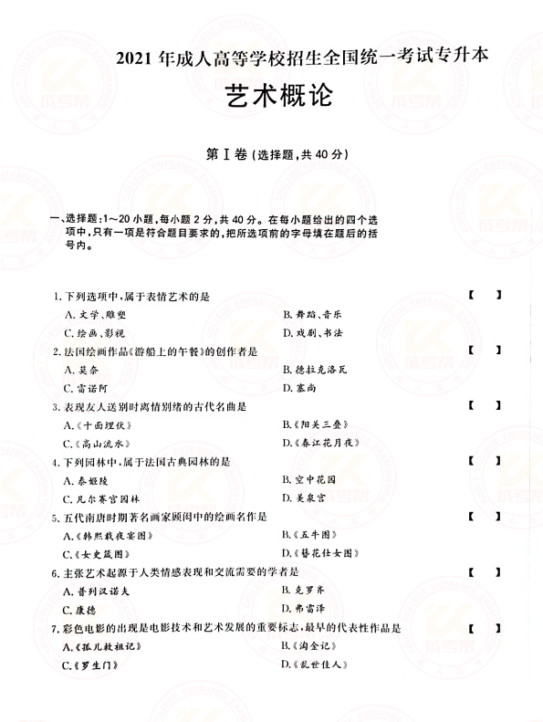 2021年重庆成人高考专升本艺术概论考试真题及答案